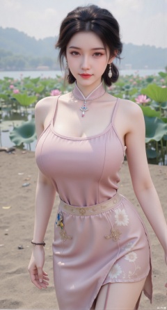 (masterpiece:1.2),best quality, (UE5.5,rendered with Unreal Engine 5,Unreal Engine 5,CG rendering), (masterpiece:1.2),,1girl,solo,standing,looking at viewer,(cowboy_shot:1.3),black hair,long hair,high heels,blurry background,depth of field,motion blur,short dress,china_dress,chinese_style,bare shouders,crystal_earrings,headpiece,hair_tie,chest_jewel,gem,necklace,jewelry,in summer,day,outdoors,nature,sea,(beach:1.4),(huge breasts:2.99),(full breasts:2.99),(lotus pond and pink lotus flowers:1.59),,(very long legs,Diamond-studded high heels:1.5),Xmupeiling,XsongyuYK,XqiyueFHK,XheguangzhefandiYK,XxiaobaiNZYK,XlimuwanJCBYK,XmeijiK,XzhouruK,XHhanfududou,XzhouruK2,XmeijiK2,XlinziyueK2,Xjinniang2,Xdunhuangfeitian