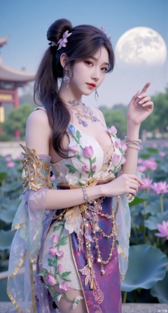 (masterpiece:1.2),best quality, (UE5.5,rendered with Unreal Engine 5,Unreal Engine 5,CG rendering),1girl, navel, solo, midriff, bare shoulders, hair ornament,(long hair),(High double ponytail:1.49), red lips, BREAK, (looking at viewer:1.39), chinese clothes,(long dress:1.36), (lace:1.28), BREAK,blurry, solo focus, long hair, lips, daytime, lipstick, outdoors, standing,upper body,(huge breasts:2.99), (full breasts:2.99),background, solo, makeup,Xyunxiao,(Lotus,Water Lily,Blue sky,full moon:1.39),(Lotus pond,ancient Chinese architecture:1.39),Xmupeiling,XsongyuYK,XqiyueFHK,XheguangzhefandiYK,XxiaobaiNZYK,XlimuwanJCBYK,XmeijiK,XzhouruK,XHhanfududou,XzhouruK2,XmeijiK2,XlinziyueK2,Xjinniang2,Xdunhuangfeitian,Xbaiyuekuishouban2,XyinzipingCOS2