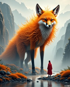 A huge, fantasy fox with intricate designs that blend seamlessly with nature. Its fur consists of bright orange and brown elements, similar to leaves and branches, giving it a natural, almost tree-like appearance. The fox stood majestic, standing high on a small figure in a red cloak who seemed to be looking up at the creature. The background is a peaceful landscape, misty mountains, lush vegetation and calm bodies of water that reflect the scene. The overall atmosphere is mysterious and extraordinary, with soft lighting, like a dream. blending elements of nature and fantasy.,Three - dimensional ancient - style arti