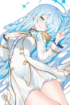 Yangling,(masterpiece:1.1),(best quality:1.1),dynamic_angle,(extremely delicate and beautiful:1.1),(huge filesize:1.1),(Noise and grain:1.1),(amazing quality:1.1),(torino:0.4),(koahri:0.4),(shea:0.3),(Qiandaiiu:0.3),\\//,1girl, solo, halo, blue eyes, long hair, white background, looking at viewer, blue hair, skirt, simple background, white skirt, long sleeves, hair over one eye, on back, braid, smile, lying, jacket, multicolored hair, white jacket, epaulettes