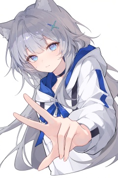 akengichi,simple,crisp,gwwj,ezu,Tender,(masterpiece:1.1),(best quality:1.1),foreshortening,dynamic_angle,(extremely delicate and beautiful:1.1),(huge filesize:1.1),(Noise and grain:1.1),(amazing quality:1.1),\\//,1girl, solo, animal ears, looking at viewer, hood, upper body, blue eyes, long hair, grey hair, white background, cropped torso, hood down, closed mouth