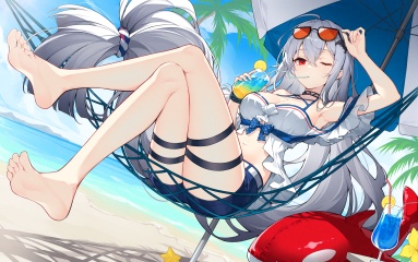 crisp,gwwj,Mika Pikazo,ezu,melting,Tender,(masterpiece:1.1),(best quality:1.1),foreshortening,dynamic_angle,(extremely delicate and beautiful:1.1),(huge filesize:1.1),(Noise and grain:1.1),(amazing quality:1.1),(wallpaper:1.1),\\//,MeIoN,1girl,skadi \(waverider\) \(arknights\),breasts,skadi \(arknights\),official alternate costume,barefoot,sunglasses,long hair,solo,red eyes,soles,feet,shorts,thigh strap,looking at viewer,large breasts,one eye closed,outdoors,short shorts,very long hair,armpits,toes,blue shorts,beach umbrella,thighs,drinking straw,eyewear on head,beach,navel,crossed legs,day,white shirt,arm up,bare legs,umbrella,legs,shirt,cleavage,hammock,grey hair,bare shoulders,sitting,hair between eyes,drinking glass,inflatable toy,low-tied long hair,stomach,
