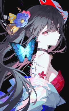 crisp,gwwj,Mika Pikazo,ezu,Tender,(masterpiece:1.1),(best quality:1.1),foreshortening,dynamic_angle,(extremely delicate and beautiful:1.1),(huge filesize:1.1),(Noise and grain:1.1),(amazing quality:1.1),(wallpaper:1.1),\\//,gwwj,good work,(best quality),illustration,depth of field,(color),masterpiece,best quality,1girl,solo,long hair,breasts,bangs,simple background,hair ornament,white background,dress,hair between eyes,bare shoulders,closed mouth,upper body,flower,hairband,off shoulder,butterfly,blue butterfly,Black hair,Red pupil,///,1girl,huahuo,twintails,fox mask,mask on head,choker,jingle bell,tattoo,high quality,(dark),(sideways),((glowing)),glitch,horror \(theme\),vibrant,black background,colorful,abstract,bioluminescence,double exposure,distortion,holographic clothing,bloom,backlighting,sidelighting,rella,wanke,konya karasue,yadu nadu,menma \(enaic31\),(quasarcake:0.8),john kafka,(otonoha aika),konya karasue,eye trail,