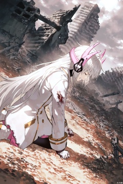 1girl,solo,liv-eclipse/(punishing gray raven),messy hair,white hair,dirty,torn-clothes,injury,