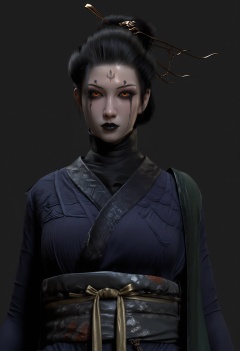 (score_9),<lora:四妹-Apony:0.83>,foursister,solo,1girl,black hair,facial mark,forehead mark,hair ornament,hair bun,hair stick,chinese clothes,sash,belt,black_eyeshadow,black lips,Willow-shaped eyebrows,large breasts,glamor,puffy breasts,pointy_breasts,<lora:a修手:0.35>,front view,arms behind back,simple background,OverallDetail,(shiny_skin),(deep_skin:1.1),<lora:perfect-eyes:0.8>,grey sclera,orange eyes,<lora:e色温:0.5>,<lora:SkinRealityOrg_ponyv6_loraplus:0.2>,real skin,<lora:detailed_notrigger:1>,