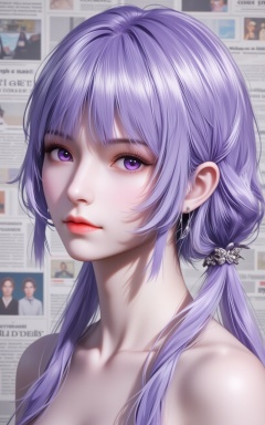 <lora:白沉香·百搭款5:1.2>,baichenxiang,1girl,twintails,purple hair,low twintails,hair tubes,hair ornament,purple eyes,braid,cover,gradient background,close-up details,outstanding style,adding a touch of dimension to your images without compromising details,close-up,<lora:DJ滤镜_2.5D版:0.4>,lvjing,<lora:油画唯美滤镜15:0.2>,baoshi,<lora:报纸背景·5:0.6>,baozhi,paper,newspaper,the newspaper wall,newspaper background,