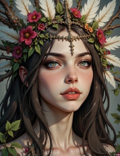 A portrait of a young woman wearing an elaborate, nature-inspired headdress made of feathers, flowers, and branches. Close-up or half-body, showcasing the intricate craftsmanship and her connection to nature. The rendering gives a highly detailed, tactile quality to the natural elements, while her features are portrayed with a gentle, artistic depth. Soft, natural lighting enhances the textures and colors of the headdress. Natural catchlights, a serene or wild expression, and the textures of feathers, petals, and leaves contrasting with her skin and hair are paramount.