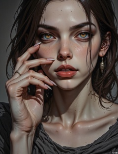A close-up portrait focusing on the expressive hands of a young woman, perhaps gently cradling a delicate object or making a subtle gesture, with her face partially obscured or softly focused. The rendering emphasizes the anatomy and texture of her hands—skin, nails, an almost sculptural quality—with great detail and tactile depth. Lighting is carefully directed to highlight the form and texture of the hands and the object they interact with. Catchlights might be on the object or subtly in her out-of-focus eyes. The background is minimal and out of focus.