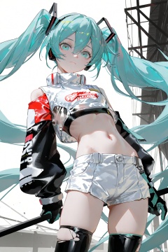 masterpiece,very aware,highres,absurdres,newest,best quality,loli,petite,high quality,chromatic_aberration,//,1girl, solo, long hair, looking at viewer, bangs, skirt, thighhighs, navel, hair between eyes, twintails, very long hair, closed mouth, multicolored hair, detached sleeves, shorts, midriff, aqua eyes, crop top, clothes, aqua hair, asymmetrical legwear, cropped jacket, white shorts, chromatic aberration, torn thighhighs, hatsune miku, racing miku,newest,masterpiece,best quality,very aesthetic,highres,highres,absurdres,//,//,(artist:ningen_mame:0.7),(artist:reoen:0.85),(nababa:0.3),(wanke:0.4),(modare:0.6),(wlop:0.6),(rei_(sanbonzakura):0.4),//,