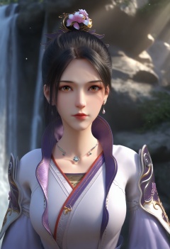 (score_9),<lora:南宫夕儿-Apony-000009:0.83>,nangonxier,solo,1girl,black hair,hair ornament,hair flower,earrings,ponytail,long hair,high collar,jewelry,necklace,shoulder armor,chinese clothes,upper body,large breasts,glamor,puffy breasts,pointy_breasts,<lora:a修手:0.35>,front view,looking at viewer,OverallDetail,fair_skin,(white_skin),(Ivory_skin),outdoors,waterfall,light rays,light particles,softened light,<lora:perfect-eyes:0.8>,brown eyes,<lora:e色温:0.5>,<lora:Expressive_H:0.8>,<lora:e肤色滑块:0.5>,<lora:SkinRealityOrg_ponyv6_loraplus:0.2>,real skin,realistic,
