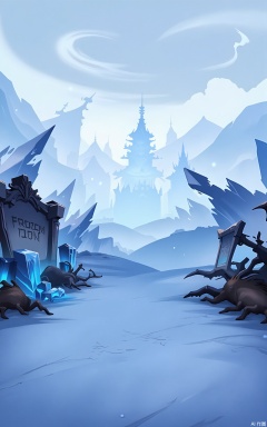 KTCJ, A digital cartoon illustration depicts a frozen tundra at dusk. A massive ice fortress with towering spires looms in the distance. The foreground shows a snowy path lit by glowing blue crystals embedded in the ice. Broken ice shards and frozen animal carcasses are scattered around, and a large sign with "FROZEN DOOM" etched into it stands nearby. The sky is a pale blue-white, with swirling snow clouds. The atmosphere is icy and desolate.