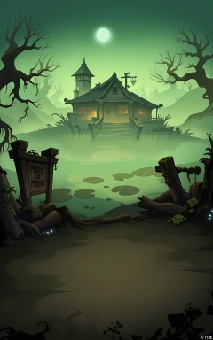 KTCJ, A digital cartoon illustration showcases a swampy marshland at twilight. A decrepit wooden shack with a crooked chimney sits on stilts in the middle of murky water. The foreground features a narrow, muddy trail with lily pads floating on either side. Slimy logs and decaying vegetation are strewn about, and a weathered sign with "MIRE OF MISERY" written on it leans against a tree. The sky is a sickly green, with gnarled trees silhouetted against it. The mood is damp and dismal.
