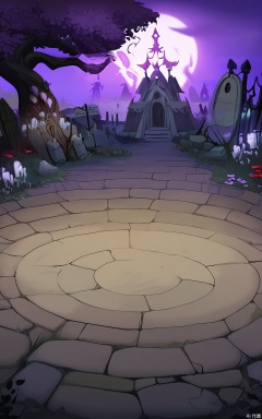 KTCJ, A digital cartoon illustration illustrates a haunted graveyard at midnight. A dilapidated mausoleum with a broken door stands in the center. The foreground shows a cobblestone path lined with tilted tombstones. Wilted flowers and broken lanterns are strewn about, and a large sign with "RESTLESS SOULS" painted on it hangs from a tree. The sky is a dark purple, with a full moon casting an eerie glow. The mood is spooky and unsettling.