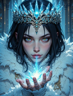 A portrait of a young ice sorceress, an elaborate crown of shimmering ice crystals adorning her brow, a faint frosty mist escaping her lips. Half-body composition, one hand encased in jagged ice, emanating a cold aura. The artwork features a sharp, crystalline surface quality, her form appearing both elegant and dangerously cold, executed with a deeply layered, almost sculpted feel. Piercing, cool light reflects off the ice, creating brilliant highlights and stark shadows. Colors are predominantly icy blues, whites, and silvers, against a backdrop of a grand, frozen palace interior or a desolate, snow-covered tundra. Her eyes reflect an inner frost, skin has a pale, cool texture, and the intricate facets of the ice are meticulously detailed.