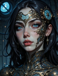 A serene portrait of a young celestial clockwork guardian, her form partially integrated with intricate, spinning astrolabes and orreries made of polished brass and silver. Facial close-up, conveying timeless vigilance. The rendering is precise and metallic, achieving a blend of smooth, polished surfaces and the complex, tangible detail of interlocking gears and celestial charts. Starlight from an observatory dome window provides a cool, focused illumination, highlighting the metallic components. The overall color palette is deep blues, silvers, and golds, against a backdrop of a star-filled sky visible through the dome. Her eyes reflect distant galaxies, and the intricate craftsmanship of the clockwork mechanisms is paramount.