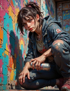 A dynamic portrait of a young woman, a street artist, mid-action with a spray can, against a vibrant, graffiti-covered urban wall. Half-body composition, exuding energy. The image has a gritty, tactile surface quality, suggesting both the rough texture of brick and the layered, matte finish of spray paint. Bright, slightly diffused daylight illuminates the scene. Sharp catchlights in her determined eyes, the detailed textures of her casual, paint-splattered clothing, and the vivid colors of the street art are key.