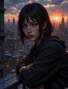 A portrait of a young woman on a city rooftop at sunset, the sprawling urban skyline silhouetted behind her. Half-body, perhaps leaning on a weathered railing, gazing at the view. The artwork features a dramatic, atmospheric surface quality, capturing the warm glow of the setting sun on her features and the deep, layered shadows. Strong, warm rim lighting from the sunset contrasts with the cooling blues and purples of the twilight sky. Her eyes reflect the city lights beginning to twinkle, her hair catches the last rays, and the cool, metallic texture of the railing is evident.