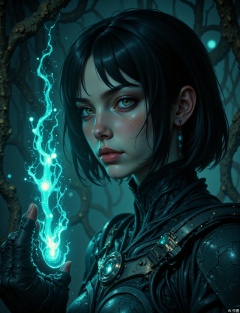 A portrait of a young xenolinguist, her face partially illuminated by the glowing, holographic interface of an alien language translator she's interacting with. Half-body composition, surrounded by strange, organic-looking alien artifacts in a dimly lit research outpost. The image has a substantial, tactile quality to its surfaces, suggesting both the smooth, high-tech feel of her equipment and the bizarre, unknown textures of the alien environment. Cool, holographic light creates sharp highlights on her features and casts long, eerie shadows. The color palette is dominated by the interface's glow (e.g., cyan or emerald) against dark, mysterious alien tones. Sharp, focused catchlights, intricate details on the holographic display, and the unique textures of her specialized suit and the alien artifacts are key.