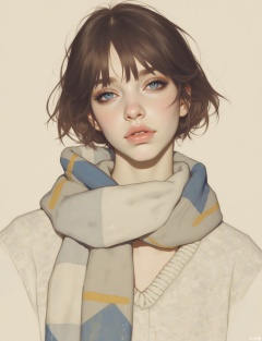 OBxiaoxiang, This image is a digital illustration featuring a young woman with a serene and slightly melancholic expression. She has fair skin, a delicate nose, and full, slightly parted lips with a natural, neutral pink hue. Her large, almond-shaped eyes are a striking blue, framed by thick, dark lashes. Her hair is shoulder-length, dark brown, and slightly tousled, with a few strands framing her face. She is dressed in a light-colored, textured sweater that appears to be knitted, with subtle patterns and a soft, cozy feel. Around her neck, she wears a scarf with a geometric pattern in shades of blue, white, and yellow, adding a touch of warmth and texture to the image. The background is a plain, light beige, which helps to focus attention on the subject. The style of the illustration is realistic with a soft, painterly quality, characterized by smooth transitions and a gentle blending of colors. The artist has used subtle shading and highlights to create a three-dimensional effect, enhancing the realism of the subject. The overall mood of the image is introspective and contemplative, capturing a moment of quiet reflection.
