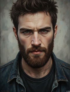 A powerful portrait of a ruggedly handsome man in his late thirties, with a well-groomed beard and intense, thoughtful eyes. Facial close-up. The image has a strong, impactful surface, conveying both the texture of his skin and beard, and a substantial, layered form. Dramatic, slightly low-key lighting, perhaps a single key light with a subtle fill, creates strong definition and shadow. The background is a simple, textured concrete wall, subtly lit to provide a slight separation. Sharp, compelling catchlights, individual hairs of his beard, and the texture of a simple denim or leather jacket collar are key.