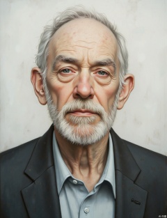 A portrait of an elderly gentleman with a distinguished, thoughtful expression, perhaps with a neatly trimmed white beard. Classic half-body composition. The image has a substantial, tactile quality to its surfaces, his experienced features and finely tailored blazer rendered with care. Soft, directional studio lighting from one side creates gentle modeling. The background is a pale gray with a subtle, linen-like texture, providing a cool, sophisticated setting. Sharp catchlights in his wise eyes, the detailed rendering of his beard and hair, and the rich texture of his wool blazer are key against the textured pale gray.