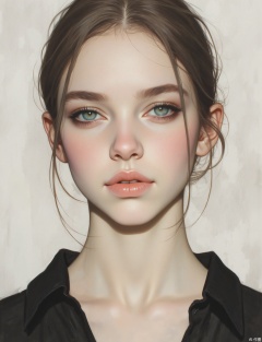 A facial close-up of a young woman with striking, clear eyes and a calm, confident demeanor. The rendering imparts a smooth, refined texture to her skin, contrasting with the subtly textured pale gray background that might resemble fine-grained stone. Crisp, clean lighting accentuates her features. Her dark, elegant attire contrasts beautifully with the pale gray. Emphasized, captivating catchlights and the soft sheen of her meticulously styled hair are crucial against the pale gray textured backdrop.