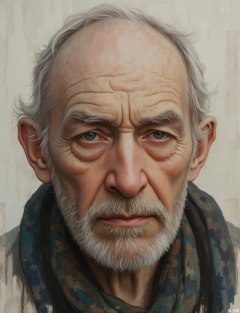 A thoughtful facial close-up of an elderly man, his face a map of life experiences, gaze directed slightly off-camera as if in deep reminiscence. The rendering imparts a profound, almost sculpted texture to his features. Soft, directional light from a single source creates gentle shadows that emphasize his wrinkles. The pale gray background has a texture resembling old, worn stone, adding to the contemplative mood. His eyes, though not directly engaging, hold a story, and the subtle texture of a well-worn wool scarf around his neck is evident.
