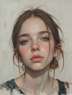A portrait of a young woman, an artist, with a smudge of paint on her cheek and an intense, creative gaze, perhaps holding a paintbrush. Facial close-up. The artwork possesses a candid, energetic quality, with a surface that feels both immediate in her expression and subtly textured in the pale gray background (maybe resembling a primed canvas). Directional light, as if from a studio window, highlights her features. Her eyes are bright with inspiration, and the varied textures of her paint-splattered apron or smock are evident.