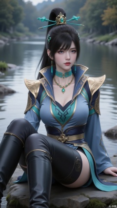 A girl is sitting on a stone by the river. She has a high ponytail and bangs. Delicate turquoise hair accessories are interspersed among her hair. She is wearing a dress. The neckline is in a unique style, and there are broad decorative shoulder plates on her shoulders. It has a blue and gold color scheme, with blue as the main color and gold outlining the edges and patterns, looking gorgeous and showing her status. She has blue eyes. There is a turquoise choker around her neck with exquisite patterns on it. The necklace has a unique shape, with a golden chain matched with emeralds. Her earrings are simple turquoise long pendants. She is wearing leather pants and long boots.