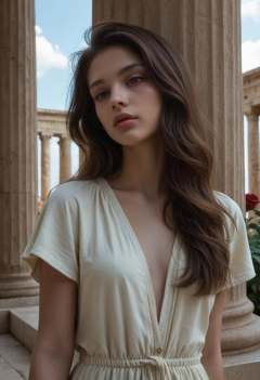 very aesthetic, score_9, score_8_up, score_7_up,masterpiece, very long hair, greek goddess white long dress with intricate gold details, (dark brown eyes:1.10), eyes focus, eye contact, (aesthetic photography:1.10), portrait, model, 1girl, solo, (pale skin:1.10), (young woman:1.10), petite, asymmetrical hair, perfect eyes, full lips, slim, wearing (white fingernails:1.05), standing, Greek environment with Greek columns, outdoors, sky, (beautiful day:1.10), roses