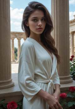 very aesthetic, score_9, score_8_up, score_7_up,masterpiece, (greek goddess white long dress with intricate gold details:1.10), (dark brown eyes:1.10), eyes focus, eye contact, (aesthetic photography:1.10), portrait, model, 1girl, solo, (pale skin:1.10), (young woman:1.10), petite, asymmetrical hair, perfect eyes, full lips, slim, wearing (white fingernails:1.05), standing, Greek environment with Greek columns, outdoors, sky, (beautiful day:1.10), roses