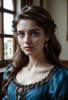 very aesthetic, score_9, score_8_up, score_7_up,masterpiece, very long hair, (clearly visible hands:1.05), (Ancient Red Bright Victorian Dress With Gown:1.10, ancient earrings, ancient gloves), (brown hair:1.05), (blue colored lens:1.07), (big eyes:1.10), (beautiful eye shape:1.07), eyes focus, eye contact, (aesthetic photography:1.10), portrait, model, solo, (pale skin:1.10), asymmetrical hair, perfect eyes, slim, wearing looking at you, (nice behavior:1.07), indoors, (victorian castlevery detailed:1.10)