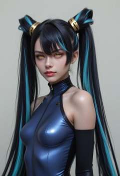 very aesthetic, score_9, score_8_up, score_7_up,masterpiece, very long hair,yellow eyes,long hair, black hair, blue hair, two-tone hair,twintails, bangs,hair between eyes,medium breasts,nail polish, eyes focus, eye contact, (aesthetic photography:1.10), portrait, model, 1girl, solo, (pale skin:1.10), (young woman:1.10), petite, asymmetrical hair, perfect eyes, slim, wearing bodysuit,elbow gloves, fingerless gloves,covered navel,bare shoulders,hair ornament, sea landscape with a marvellous ocean