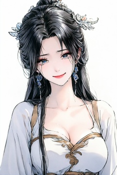 <lora:01古风美女第一版:0.8>,1girl,earrings,jewelry,solo,black hair,crying,breasts,upper body,hair ornament,dress,long hair,chinese clothes,looking at viewer,tears,smile,crying with eyes open,collarbone,large breasts,cleavage,white background,simple background,hair bun,