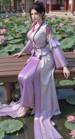 (masterpiece:1.2),best quality,,(UE5.5,rendered with Unreal Engine 5,Unreal Engine 5,CG rendering:1.1),The image is a digital illustration of a young woman sitting on a wooden bench in a pond with lily pads. She is wearing a long dress with design on the chest and sleeves. The dress has a high neckline and short sleeves,Holding a lotus in hand. She has long dark hair styled in loose waves and is wearing gold high heels. The woman is posing with one hand on her hip and the other resting on the edge of the bench. The background is filled with pink and white lotus flowers and green leaves. The overall mood of the image is peaceful and serene,(huge breasts:2.99),(full breasts:2.99),(Background with traditional Chinese architecture, lotus pond and pink lotus flowers:1.39),,Xmupeiling,XsongyuYK,XqiyueFHK,XheguangzhefandiYK,XxiaobaiNZYK,XlimuwanJCBYK,XmeijiK,XzhouruK,Xjinniang,Xliangpianqun,Xyinggou,Xfeitianwunv,XnangongxierK