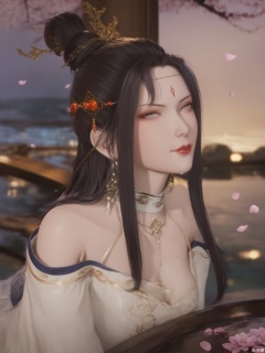 score_9,score_8_up,score_7_up,1girl,looking_at_viewer,realistic,1girl,Vivid Colors,bright environment,delicate water,hair_ornament,shiny skin,shiny hair,reflection,(wariza:1.2),white dress,jewelry,flower sea,falling petals,extreme detail description,(upper body:0.4),put one hand on your side,long_hair,(skindentation:1.3),Fishnet stockings,bright,sunshine on face,chinese_clothes,forehead mark, single hair bun,