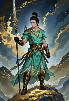 A stoic warrior in jade-green armor stands atop a misty mountain peak, his spear gleaming with gold leaf accents. The background blends indigo mineral washes with swirling gold clouds resembling ink diffusion.