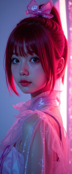 fujibayashi sheena,tales of symphonia,ninja,everyone,ofuda,short ponytail,pink bow,brown eyes,red hair,,(((photo raw)), global illumination and Soft Edge Lighting Matte Painting , ,),from side,Alternate Reality, Stylish Fashion, Creative Art, Unique Aesthetic,Alternative Style,reflective light,glowing,energy, reflection ,wearing see-through ice wash, ,