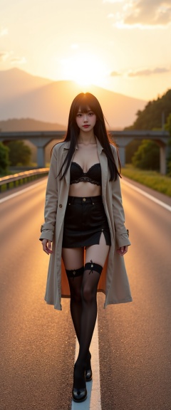 a high-resolution photograph featuring a young asian woman standing on a long, empty highway at sunset, the woman has long, straight black hair and a fair complexion, she is dressed in a black, form-fitting mini-skirt that accentuates her slender physique, and a long beige trench coat that drapes over her shoulders, revealing a black lace bra underneath, her black stockings are tattered and worn, adding a sense of vulnerability to her outfit, she wears black high-heeled shoes, completing her edgy look, the background shows a concrete bridge over a lush green forested area, with a distant mountain range under a soft, cloudy sky, the sun is setting, casting a warm, golden glow over the scene, the overall mood of the photograph is serene yet provocative, with the woman's confident stance and the serene landscape providing a stark contrast to her modest attire, the photograph captures a moment of quiet contemplation, emphasizing the beauty and solitude of the setting, The golden hues of the setting sun bathe the scene in a warm, ethereal light that accentuates the woman's confident silhouette and the tranquility of the landscape, while the soft clouds above add a touch of serenity to the provocative atmosphere,,(((photo raw)), Silhouette Lighting and High-Key Lighting Fisheye Distortion and volumetrics dtx , ,),from front,Alternate Reality, Stylish Fashion, Creative Art, Unique Aesthetic,Alternative Style,reflective light,glowing,energy, reflection ,wearing see-through Hanfu,