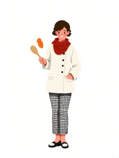 BPJS, Illustration of a female chef, medium close-up, front view, holding a wooden spoon. She wears a white double-breasted coat, red scarf, and black-and-white houndstooth pants. Background is plain white. Short curly brown hair, smiling. Simple flat shapes with minimal shading.