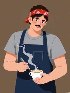 BPJS, Illustration of a male barista, medium close-up, side profile, making latte art. Navy apron over gray shirt, red bandana. Mustache, focused gaze. Flat vector style with coffee cup steam patterns.