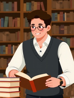 BPJS, Illustration of a male librarian, three-quarter view, holding open book. Round glasses, sweater vest over button-up shirt. Stack of books beside him. Warm earth tones with bookshelf texture background.