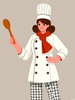 BPJS, Illustration of a female chef, medium close-up, front view, holding a wooden spoon. She wears a white double-breasted coat, red scarf, and black-and-white houndstooth pants. Background is plain white. Short curly brown hair, smiling. Simple flat shapes with minimal shading.