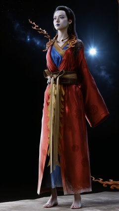 (score_9),<lora:亢金龙-Apony:0.85>,kangrixingjun,solo,black hair,long hair,hoop earrings,makeup,forehead mark,blue lips,blue eyeshadow,chinese clothes,branch,open choker,belt,sash,red robe,1girl,collarbone,full body,barefoot,(arms_behind_back:1.4),<lora:a修手:0.35>,front view,light rays,light particles,softened light,simple background,night,starry sky,stars,the milky way,OverallDetail,(Ivory_skin),((colored skin)),deep_skin,<lora:perfect-eyes:0.8>,<lora:Expressive_H:0.8>,<lora:SkinRealityOrg_ponyv6_loraplus:0.25>,real skin,realistic,<lora:detailed_notrigger:1>,<lora:皮肤凹痕:1.5>,