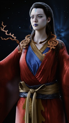 (score_9),<lora:亢金龙-Apony:0.85>,kangrixingjun,solo,black hair,long hair,hoop earrings,makeup,forehead mark,blue lips,blue eyeshadow,chinese clothes,branch,open choker,belt,sash,red robe,(mature:1.1),1girl,collarbone,large breasts,disgust,disdain,jitome,<lora:a修手:0.35>,front view,light rays,light particles,softened light,simple background,night,starry sky,stars,the milky way,OverallDetail,(Ivory_skin),((colored skin)),deep_skin,<lora:perfect-eyes:0.8>,<lora:Expressive_H:0.8>,<lora:SkinRealityOrg_ponyv6_loraplus:0.25>,real skin,realistic,<lora:detailed_notrigger:1>,<lora:皮肤凹痕:1.5>,