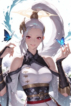 <lora:jiandie-000178:1>,vagabond \(dungeon and fighter\),clothes: vagabond def chinese clothes,red eyes,silver hair,high ponytail,vagabond hair ornament,1girl,solo,long hair,very long hair,white hair,open lips,breasts,smile,bare shoulders,medium breasts,nails,upper body,teeth,depth of field,holding,looking at the viewer,raising hands,looking up,standing,cowboy lens,blur,water,liquid,simple background,white background,(ink:1.3),butterfly,bug,flower,nail polish,masterpiece,high resolution,absurd,beautiful,very beautiful,drawing\medium\,charcoal\medium\,floral pattern,(light and shadow contrast:1.3),chaos art,bright colors,multicolor,high contrast,glitch background,Halo,Light particles,lens flare,