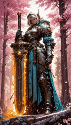 hkstyle,, holding weapon, fighting stance, holding buster sword,huge weapon,, fantasy anime style, anime artwork, official art, highly detailed, vibrant colors, magical atmosphere, digital painting, ethereal glow, soft shadows, cinematic lighting masterpiece, best quality, high quality, ultra-detailed, realistic, traditional media, western comics \(style\) ,limited palette, partially colored, vivid_color, high contrast, speed lines, sound effects, move_effects, action Create a vivid portrayal of a futuristic warrior standing amidst a serene backdrop of cherry blossom trees in full bloom. The warrior is adorned in ornate armor, predominantly in shades of gold and silver, with intricate designs and patterns. The helmet of the warrior is a striking shade of blue, contrasting with the metallic sheen of the armor and the vibrant green glow emanating from the sword. The scene is bathed in a soft, ethereal light, casting gentle shadows and highlighting the delicate beauty of the blossoms. The overall style of the image leans towards a blend of realism and fantasy, with a focus on the interplay of light and shadow to create depth and dimension. The scene is captured from a sideview angle, focusing on the full body of the warrior. 1girl, solo, holding, standing, weapon, outdoors, cowboy_shot, sword, holding_weapon, armor, tree, holding_sword, robot, cherry_blossoms, faceless, science_fiction, gold_trim, joints, glowing_weapon, humanoid_robot, glowing_sword, hkstyle,, holding weapon, fighting stance, holding buster sword,huge weapon,, fantasy anime style, anime artwork, official art, highly detailed, vibrant colors, magical atmosphere, digital painting, ethereal glow, soft shadows, cinematic lighting