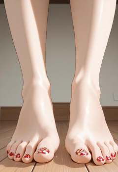 1girl, solo, barefoot, feet, wooden floor, (patterned toenail_polish), ((close-up)), lower_body, spreading toes, detailed feet, feet_focus, perfect toes, toes focus, close-up on toes, five_toes, from below