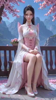 score_9_up,score_8_up,score_7_up, (high definition, Best quality, masterpiece, 4K, exquisite skin), (petal and beam background:1.1), 1girl, big chest, looking at viewer, sitting, shoes