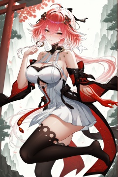 best quality,very aesthetic,pink lips,thin lips,domineering lady,*****,sexy,(from side:1.1),sakura-patterned furisode kimono,obi with golden crane embroidery,translucent uchikake overcoat,gradient indigo fabric folds,hairpin with dangling shide paper,maiko-inspired features: snow-white neck makeup,gradient pink lips,maple-leaf hair ornaments,dynamic composition: spinning parasol motion blur,floating ikebana petals,glowing kamon crest projection,fusion background: floating torii gate staircase,digitalized Kyoto nightscape,bioluminescent bamboo forest,holographic koi pond,pixel-art clouds,neon lantern arrays,technical specs: vertical 9:16 aspect ratio,ukiyo-e inspired linework,cel-shaded color blocks,8K silk texture mapping,sakura particle physics,ambient character glow,depth-blurred city lights,traditional washicolor gradients,chromatic aberration on neon elements,dynamic wind simulation on sleeves,metallic foil reflections,atmospheric perspective mist,anime-style rim lighting,wallpaper-optimized negative space,Pantone 2024 color scheme (mystic plum/digital gold).,cowboy_shot,<lora:长离长离:1>,changli,1 woman,yujie,long hair,bangs,hair ornament,thighhighs,gloves,dress,cleavage,hair between eyes,bare shoulders,yellow eyes,pink hair,ahoge,red hair,black thighhighs,white dress,no shoes,gauntlets,red gloves,single glove,single gauntlet,